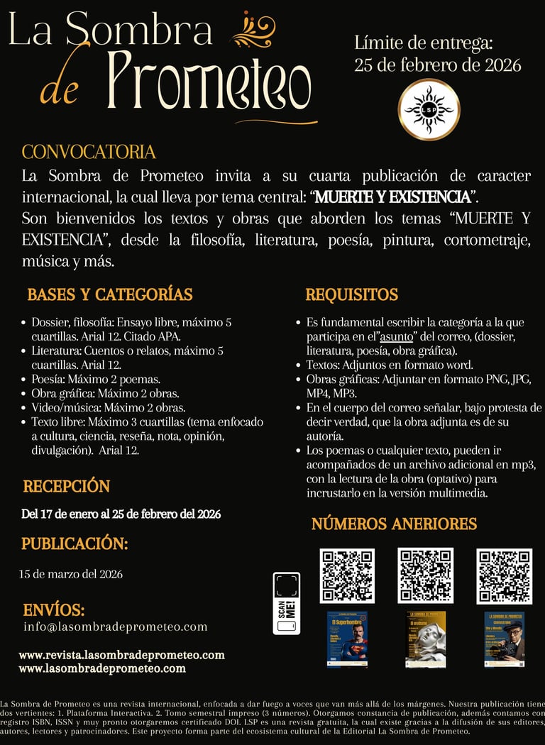 La Sombra de Prometeo invita a su cuarta publicación de caracter internacional, la cual lleva por tema central: “MUERTE Y EXISTENCIA”.