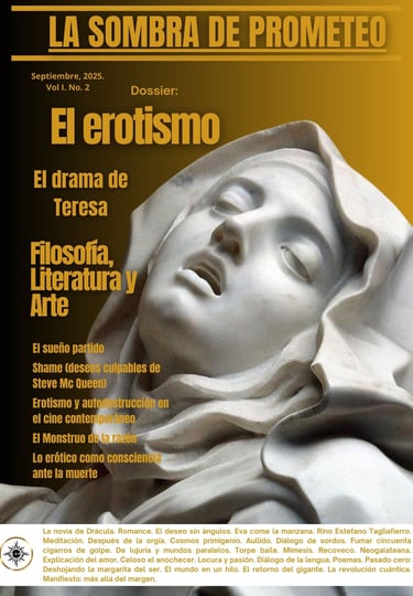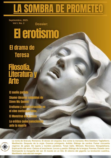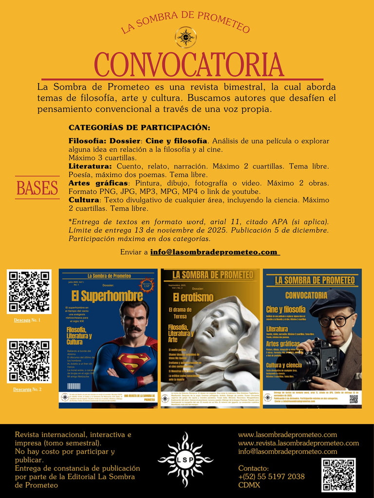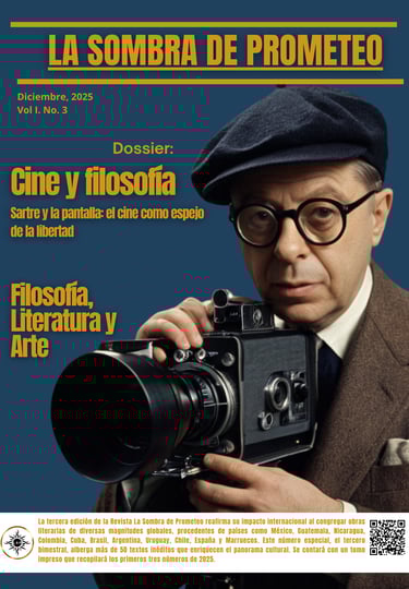 El tercer número de La Sombra de Prometeo es un volumen especial dedicado al diálogo entre cine y filosofía, que completa el primer ciclo editorial bimestral de 2025. El dossier central reúne ensayos que abordan a Sartre, Matrix, Arrival, Blade Runner, Star Wars y el western, articulando reflexiones sobre libertad, identidad, tecnología y condición humana a través del lenguaje cinematográfico. La revista amplía notablemente su alcance internacional con voces de México, Guatemala, Nicaragua, Colombia, Brasil, Chile, Argentina, Uruguay, España y Marruecos, así como más de 50 textos inéditos. A las piezas del dossier se suman cuentos, poesía, arte visual, cortometrajes y una sección de cultura y ciencia donde se exploran figuras como Miguel Hernández y Quevedo, además de temas como el universo cuántico y la relación entre matemáticas y poesía.
